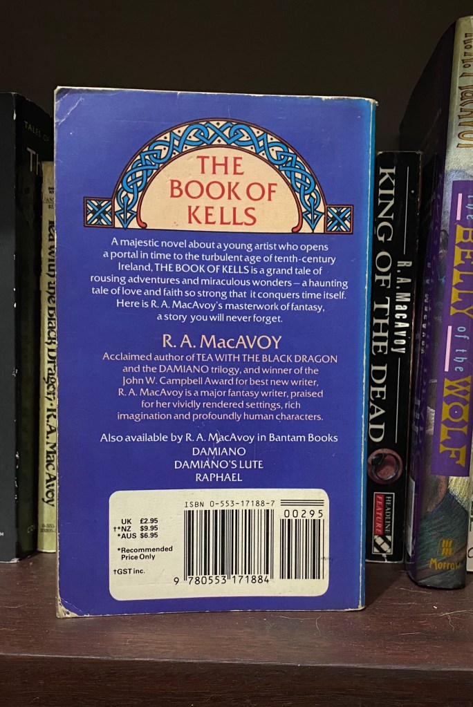 R. A. MacAvoy burst onto the Fantasy world with her award-winning debut novel Tea With The Black Dragon in 1983. She followed this unconventional first novel up with her Damiano trilogy, set in fourteenth-century Italy. All four of these novels were hailed by critics but somehow failed to set the world aflame. The Book Of Kells (1985) was her fifth novel, and it was just as different from those previous books as they were from each other.